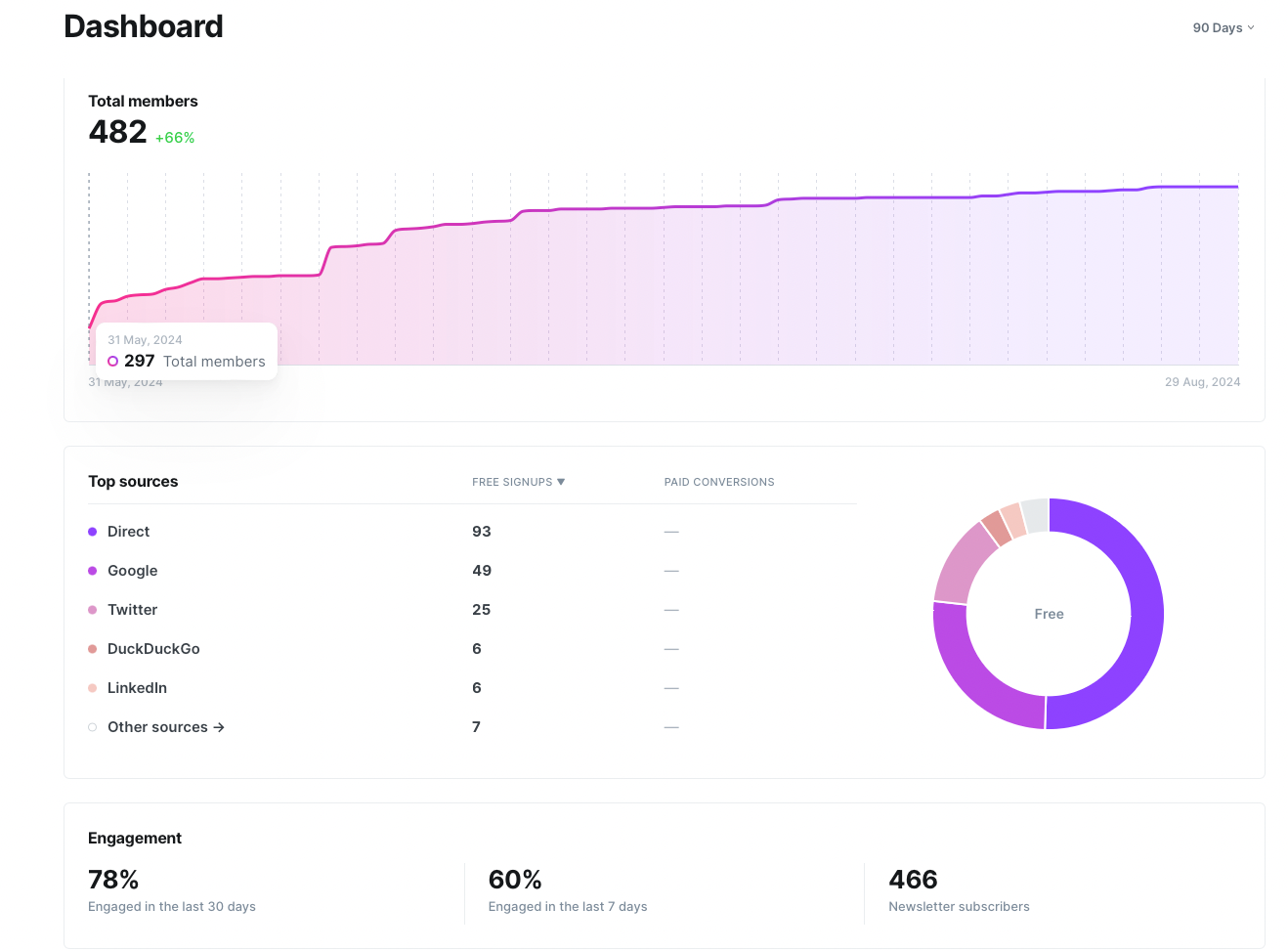 In case you're curious, here is the graph the newsletter platform (Ghost) gives me of sign-ups from the last 90 days - it seems most people join directly from the URL, which aligns with the little jumps happening when I do media bits. Shout out to the 6 of you who found me through DuckDuckGo.