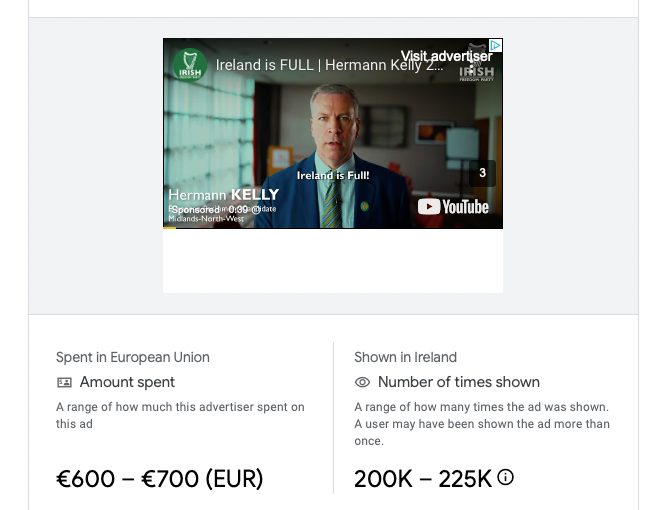The Irish Freedom Party, Eurosceptics who received between 0.19% and 2% in elections over the past 6 years, have spent €4,100 in the past 3 weeks on video ads on YouTube. This makes them the biggest spenders on YouTube ads this election.