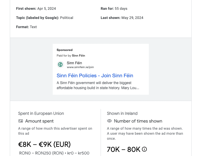 One of these ads, a simple text ad linking to the "Join" page of their website, cost up to €9k, and was seen over 70,000 times. This high cost per view suggests a targeted approach, with Sinn Fein paying more for coveted Google results page spots for popular search terms, though no information on that is available (any tips - let me know).