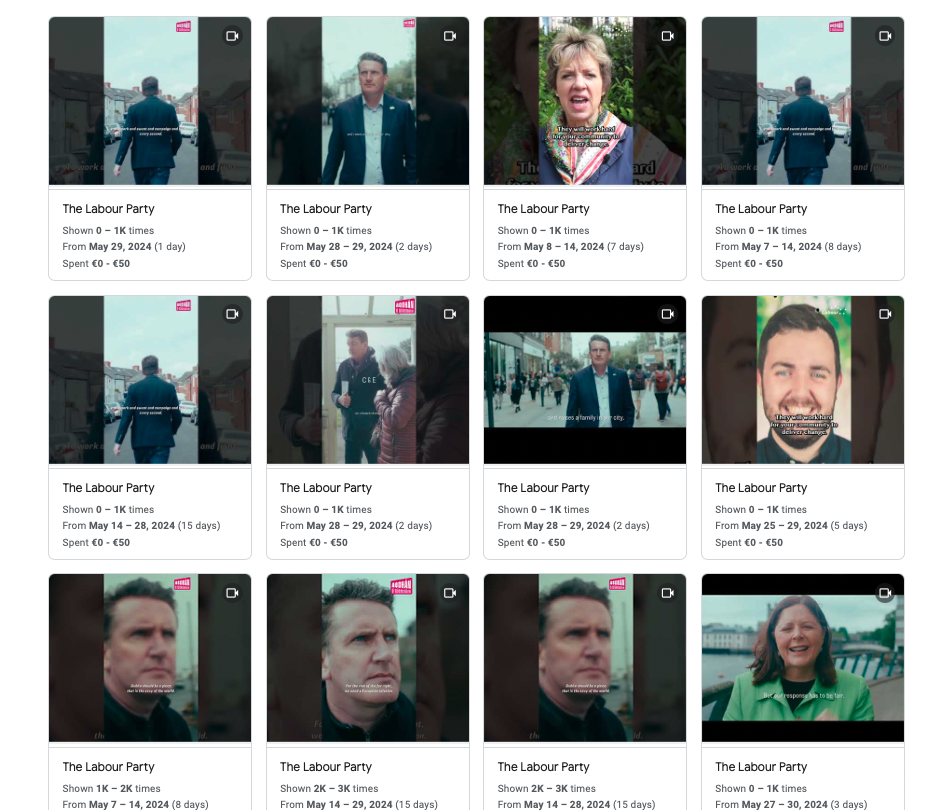 Interestingly, no Government party - Fine Gael, Fianna Fáil, Greens - is running ads via Google, and prominent candidates don't appear in the archive either.