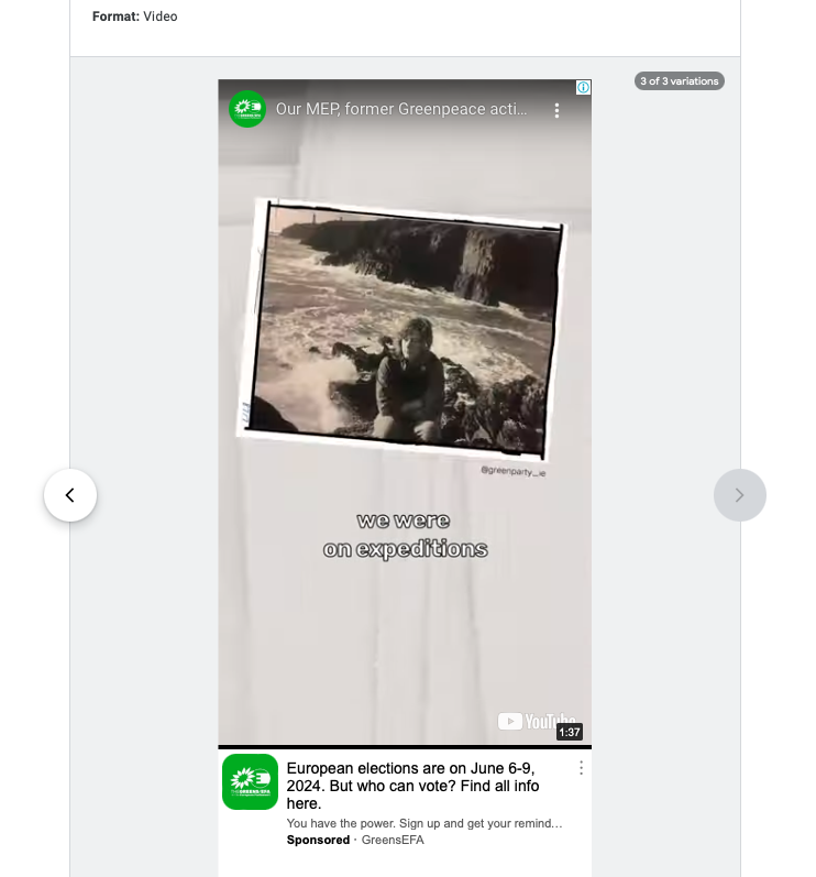 The European Greens were running ads back in April, but seem to have stopped. We will see if they come back - this video of Irish candidate Grace O'Sullivan, shown across Europe, is a great example of personal political storytelling.