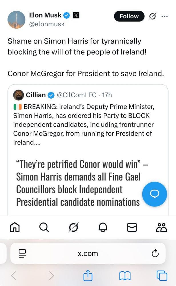 Musk's contribution is to then layer on top that Harris is "tyrannically blocking the will on the people of Ireland".