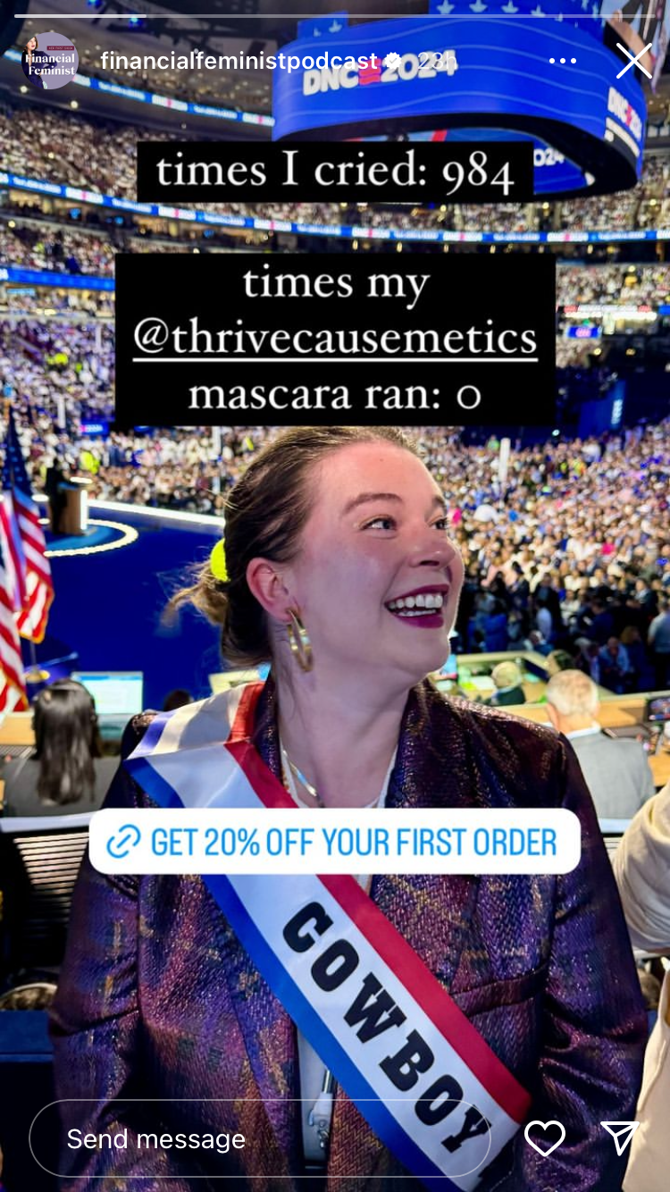 Yes that is an influencer shilling mascara at an election rally, afflink and all.
